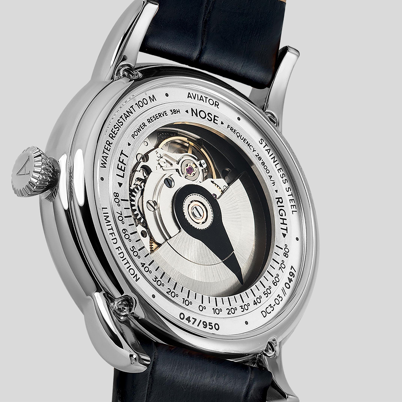Корпус: Нержавеющая сталь марки 316L. Объемный циферблат с центральной частью серебристого цвета. Стрелки и часовые индексы покрыты люминесцентным составом SuperLuminova. Сапфировое стекло с антибликовым покрытием. Переводная коронка с двойным уплотнителем для дополнительной защиты. Задняя крышка с прозрачным окном из сапфирового стекла имеет винтовое соединение с корпусом. В оформлении задней крышки использована стилизация под один из инструментов управления из кабины самолета Douglas DC-3. Гравировка с градусами на крышке корпуса и стрелка на роторе автоподзавода имитируют функцию угла перекладки руля, которая контролирует положение передней и задней частей самолета. Водонепроницаемость 100 метров. Диаметр 45 мм.