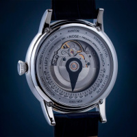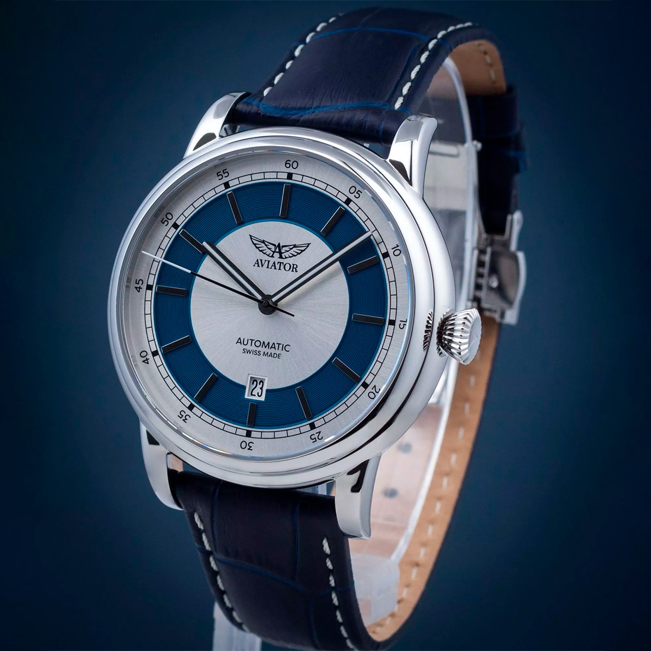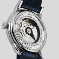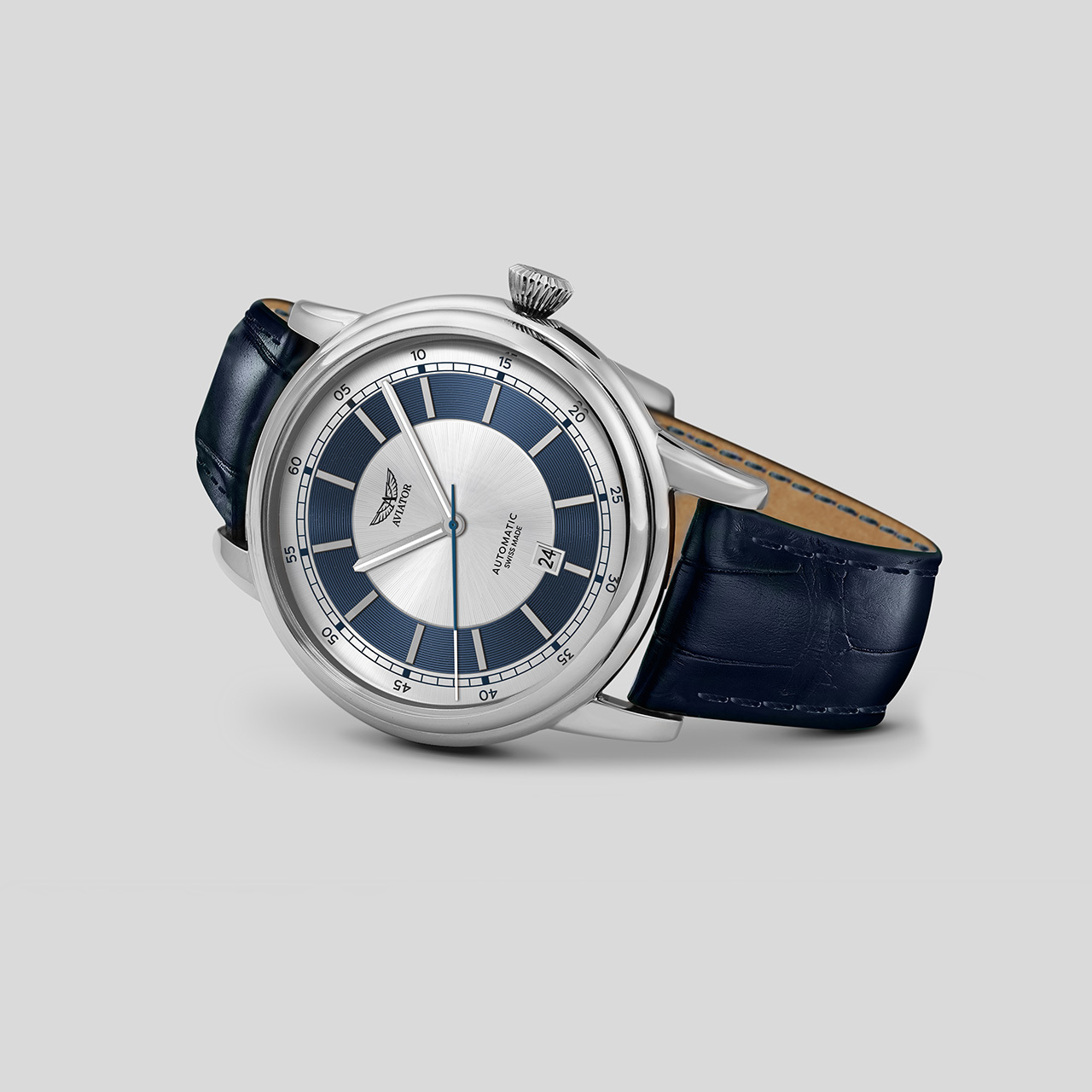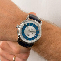 Ремешок: Синий ремешок из телячьей кожи с тиснением под аллигатора. Браслетная застежка из нержавеющей стали, раскладывающаяся при нажатии кнопок двойной блокировки.