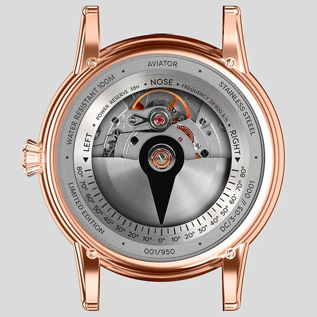Корпус: Корпус круглой формы выполнен из нержавеющей стали марки 316L с PVD покрытием, цвета розового золота. Циферблат выполнен по технологии sun-ray (солнечные лучи). Часовые метки выполнены в виде штрихов. Стрелки и метки с покрытием SuperLuminova. Сапфировое стекло с двусторонним антибликовым покрытием. Прозрачная задняя крышка украшена имитацией функции контроля управления хвоста самолета. Ротор механизма указывает на градусы, как в авиационном приборе триммер. Диаметр 45 мм, толщина 11,1 мм. Водозащита 100 метров.