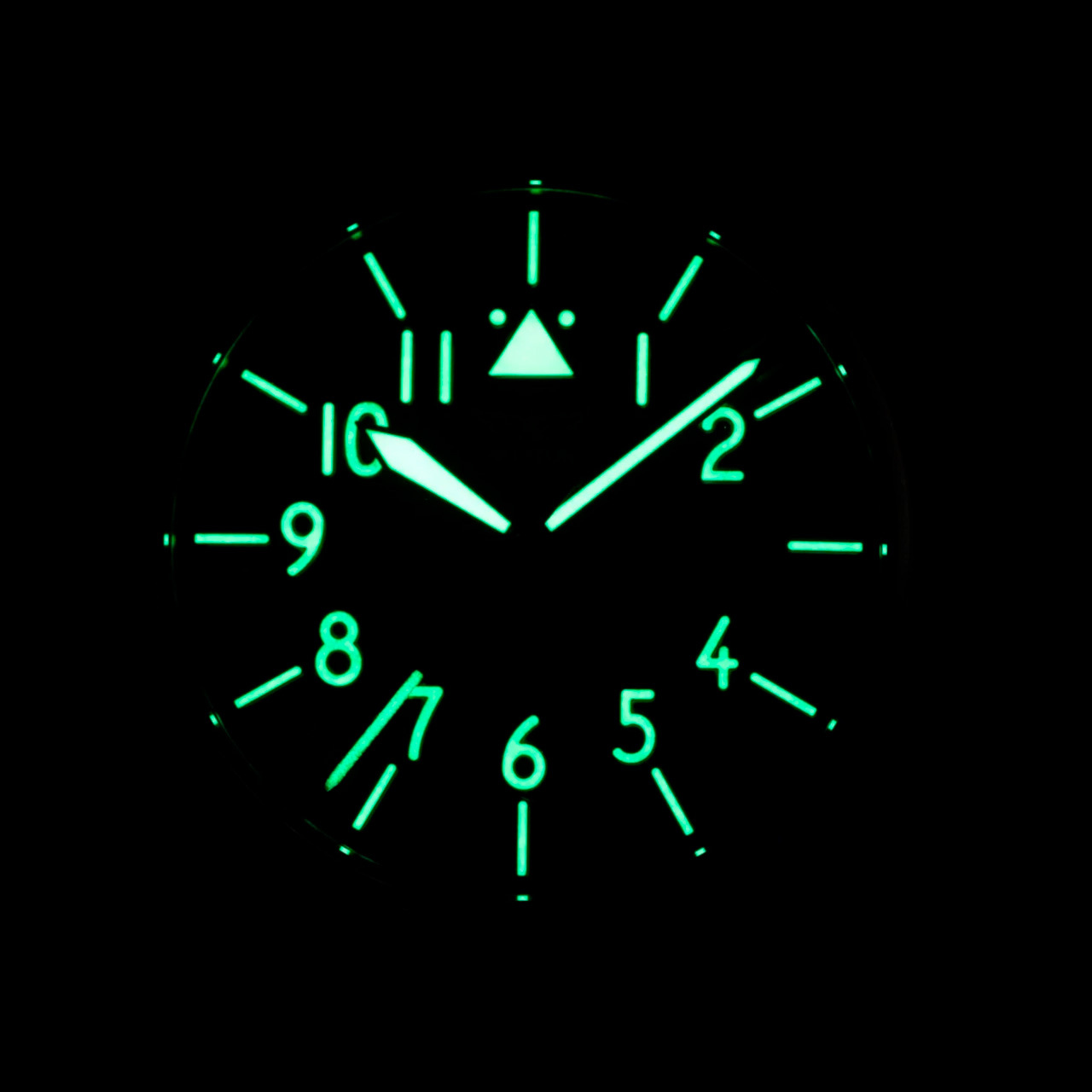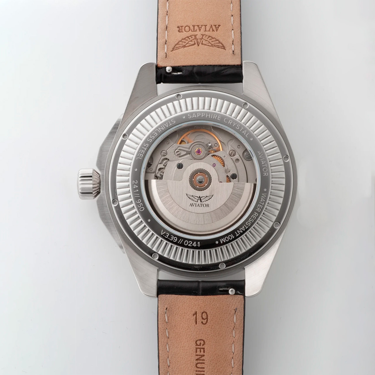Корпус: Корпус круглой формы выполнен из нержавеющей стали марки 316L. Рифленая заводная головка увеличенного размера для удобства вращения рукой в летной перчатке, с гравировкой в виде буквы «A». Циферблат чёрного цвета. Метки в виде арабских цифр. Стрелки с покрытием SuperLuminova. Сапфировое стекло с двусторонним антибликовым покрытием. Диаметр 42,8мм, толщина 10,9мм. Водозащита 100 метров.