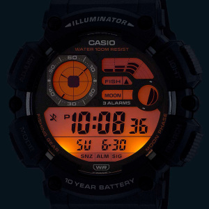 Функции: Формат времени 12/24, вечный календарь до 2099 года, функция летнего времени (DST), двойное время, 3 независимых будильника, сигнал начала часа, секундомер с точностью 1/100 секунды и измерением до 23 часов 59 минут 59,99 cек., таймер обратного отсчета (диапазон времени 24 часа), возраст/фаза Луны для определенной даты с построением графика фаз Луны, режим рыбалки (соответствие конкретной даты и времени для рыбалки указывается в виде одного из четырех уровней), диодная подсветка циферблата с возможностью выбора продолжительности свечения (1.5 или 3 секунды), функция выключения звука нажатия кнопок (Mute).