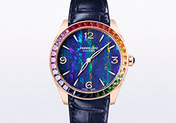 Новые часы Tonda Metropolitaine 36 мм подчеркивают красоту земных цветов благодаря радужному безелю из драгоценных камней багетной огранки и голубому опаловому циферблату. Эти радужные часы выпущены в количестве 5 штук по всему миру.