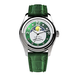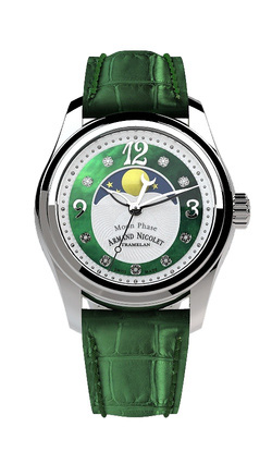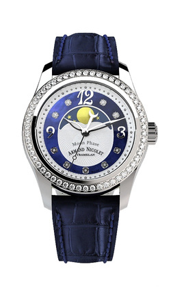 - Циферблат инкрустирован накладными цифрами и индексами, напоминающими бриллианты, а конец секундной стрелки украшен месяцем.