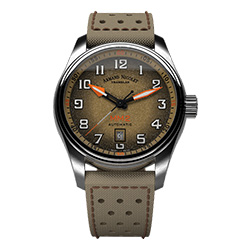 В новых моделях Armand Nicolet особое внимание уделено техническим деталям и эстетическим характеристикам. Так «летный» характер этих часов передают не только классические форма и цвет циферблата, но и перфорированный холщовый ремешок.