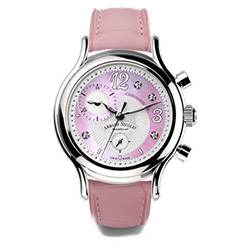 Каждая деталь является результатом поиска элегантности: красивый гильошированный циферблат украшен вставками из перламутра с бриллиантами в качестве часовых меток. Перламутровый циферблат выполнен в четырех цветах, соответствующих оттенкам кожаного ремешка с рисунком аллигатора на застежке-молнии S/S 316L, что подчеркивает изысканный дизайн.