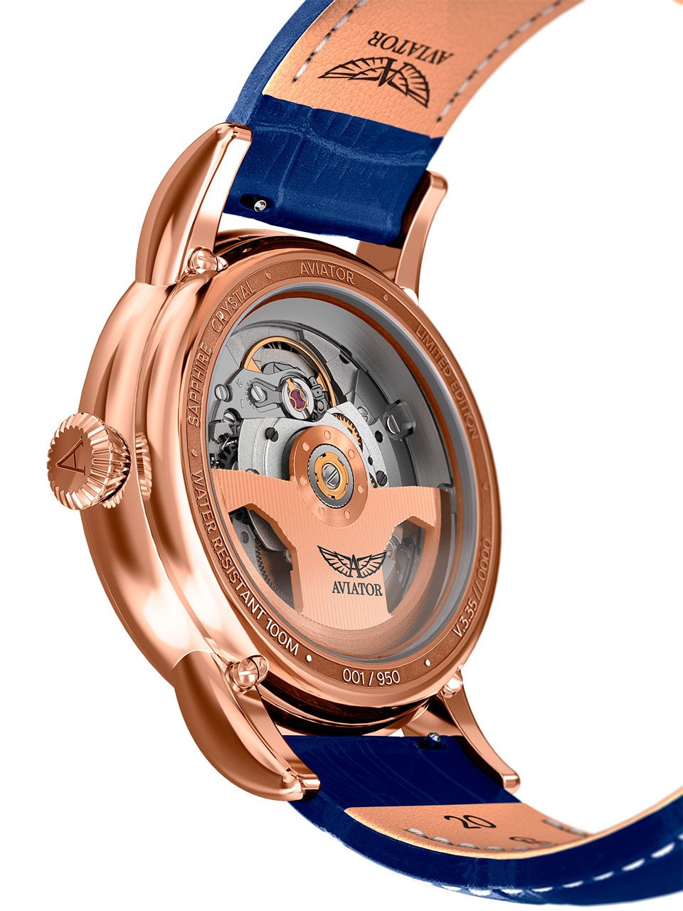 Сердцем часов стал новый калибр AVIATOR AV-1000 на основе известного швейцарского механизма Sellita SW240-2. Эта модель сочетает изящность оформления с высокой функциональностью. В часах предусмотрена функция отображения дней недели и дат, а значит, сверяться с календарем будет проще. Система Incabloc обеспечивает превосходную устойчивость к ударам и падениям. Ротор механизма увеличен и выполнен с особой тщательностью, воспроизводя узор циферблата для отражения стиля ар-деко даже на задней крышке часов.
