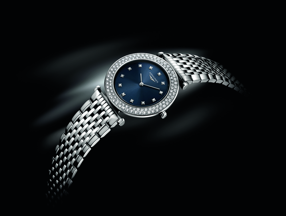 Эти часы объединяют в себе классическую элегантность ультратонких моделей и сияние 100 бриллиантов. Особого внимания заслуживает ультратонкий корпус, толщина которого составляет всего 4.60 мм. Такой параметр достигнут благодаря уникальному дизайну корпуса, запатентованному Longines: задняя крышка является в то же время креплением браслета. Новые модели украшены 100 бриллиантами Top Wesselton VVS по безелю и 12 бриллиантовыми индексами. Циферблаты нескольких оттенков, но особенно эффектно бриллианты сверкают на синем циферблате.