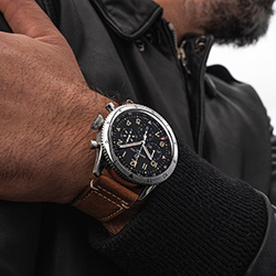 Одна из особенностей моделей из серии Super AVI – крупные, прекрасно читаемые арабские цифры на циферблате и безеле. На массивном корпусе диаметром 46 мм напротив метки «3 часа» выделяется крупная заводная головка. Рифление на безеле обеспечивает надежный захват, а отстрочка на ремешках из телячьей кожи напоминает отделку старинного летного снаряжения.