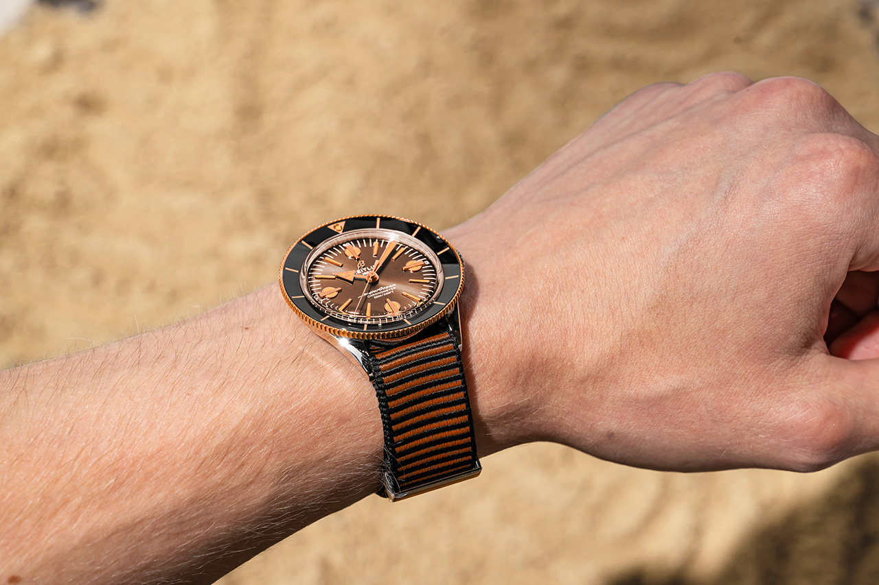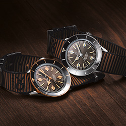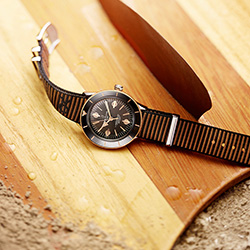 Версия из нержавеющей стали оснащена циферблатом бронзового цвета, что придает ей уникальный оттенок современного ретро. Образ дополняет коричневый ремешoк NATO Outerknown из материала ECONYL®. Вогнутый безель из нержавеющей стали, вращающийся в оба направления, оснащен ультрапрочным удароустойчивым керамическим кольцом с люминесцентной центральной меткой в положении «12 часов» – идеальный вариант для дайвинга.
