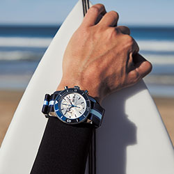 Хронометр в 44-миллиметровом корпусе из нержавеющей стали дополнен ремешками NATO из инновационного материала ECONYL®, который производят из нейлоновых отходов (к примеру, из использованных рыболовных сетей). Эти ремешки отличаются высокой прочностью, а характеристики ECONYL® позволяют перерабатывать его неограниченное количество раз. Часы имеют сатиновый ремешок NATO с синими полосками. Дополнительно в комплект входит синий сатиновый ремешок NATO. Коробка часов также изготовлена из экологичного материала, который может быть на 100% утилизирован.