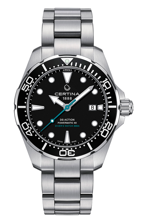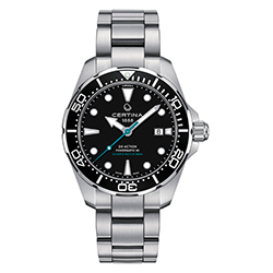 Новые дайверские часы от Certina отлично себя чувствуют как на суше, так и под водой: они отвечают всем требованиям стандарта ISO 6425 в качестве модели для дайвинга. Под конструкцией корпуса из нержавеющей стали диаметром 43 мм скрыт автоматический калибр Powermatic 80 с запасом хода в 80 часов. Однонаправленно вращающийся безель, покрытие Super-LumiNova®, завинчивающаяся заводная головка и крышка завершают сверхпрочную концепцию DS Concept и обеспечивают водонепроницаемость на глубине до 300 метров. Матовый браслет часов, выполненный из нержавеющей стали, оснащен раскладывающейся застежкой с двумя кнопками и удлинителем для дайвинга. Синяя секундная стрелка и надпись «Diver's Watch 300 м» аналогичного оттенка напоминают о фирменном цвете организации Sea Turtle Conservancy – аквамарине. На задней части корпуса размещен ее фирменный логотип в виде черепахи.