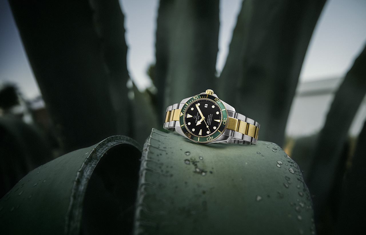 Название часов говорит само за себя – DS Action Diver всегда готовы к любому виду активной деятельности. Они станут надежным спутником как на рабочем совещании, так и в бассейне или на торжественном ужине. Универсальность модели подчеркивает ее элегантное исполнение в спортивном стиле в сочетании с характеристиками ультрапрочных часов для подводных погружений. Черный лакированный циферблат оснащен золотистыми часовыми отметками и стрелками с покрытием Super-LumiNova®, обеспечивающими прекрасную считываемость показаний даже в темноте. Циферблат обрамлен однонаправленно вращающимся безелем из алюминия изумрудно-зеленого оттенка, дополненным золотистой шкалой для отсчета времени погружения и люминесцентными отметками. Двухцветный браслет из нержавеющей стали со звеньями с золотистым PVD-покрытием и застежка с удлинением для дайвинга завершают образ этой модели.