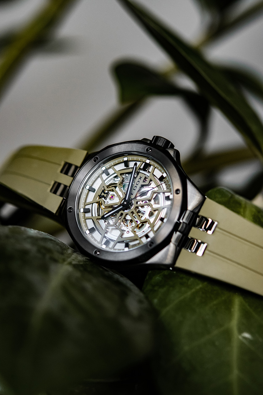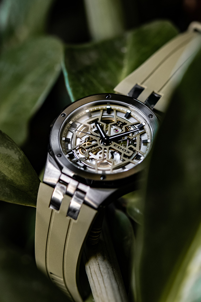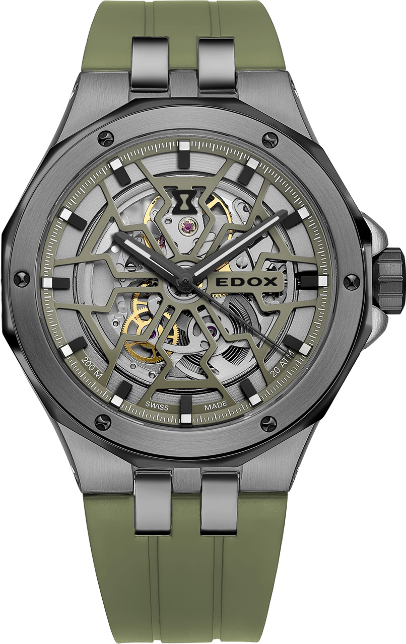 Часы Delfin Mecano от Edox стали настоящим хитом среди любителей часов по всему миру. Теперь бутик швейцарского часового производителя расширяет семейство Delfin Mecano новой моделью, выполненной в изысканной прохладной цветовой гамме. Сочетание грифельно-серого безеля и выступов в сочетании с ремешком цвета мха и скелетонизированными вставками на циферблате создает на запястье смелый, но утонченный вид часов.