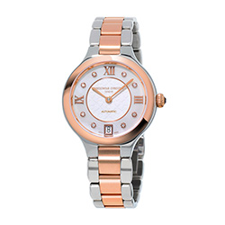 4. Frederique Constant Classics Delight Automatic FC-306MC3ER2B Корпус из полированной нержавеющей стали с розово-золотым гальваническим покрытием безеля. Циферблат с отделкой серебристым перламутром по цифровому полю и серебристым узором гильоше по центру. Воронёные центральные стрелки и чёрные печатные римские цифры, прямоугольное окошко даты. 3-рядный браслет из нержавеющей стали с розово-золотым гальваническим покрытием центральных звеньев. Раскладывающаяся стальная застёжка с розово-золотым гальваническим напылением. |