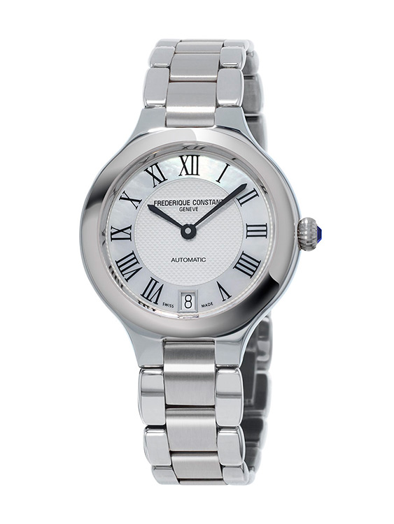На циферблате, с отделкой серебристым перламутром по цифровому полю и белым либо серебристым узором гильоше по центру, установлены центральные стрелки часов и минут в стальном полированном, розово-золотом или воронёном исполнении. Индикация представлена: римскими цифрами (III, IX, XII) из полированной нержавеющей стали и восемью бриллиантами, стальными римскими цифрами (III, IX, XII) с розово-золотым гальваническим покрытием и таким же количеством бриллиантов, либо чёрными печатными римскими цифрами, а также окошком даты на отметке «6 часов». Дополнительным декором циферблата являются изящные надписи: «Frederique Constant – Geneve – Automatic – Swiss Made».