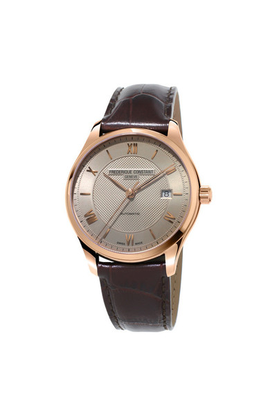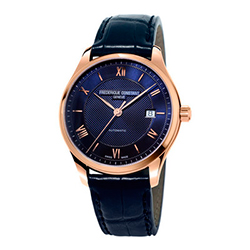 Часы Frederique Constant из семейства Classics оснащены автоматическим часовым механизмом FC-303 с 38-часовым запасом хода. Гильошированный циферблат темно-синего или светло-серого цвета показывает часы, минуты, секунды и дату. Окошко указателя даты находится в положении «3 часа». Часы в полированном стальном корпусе диаметром 40 мм носятся на ремешке из телячьей кожи с тиснением под крокодиловую кожу. Стальная модель с темно-синим циферблатом в качестве крепления имеет полированный браслет из нержавеющей стали.