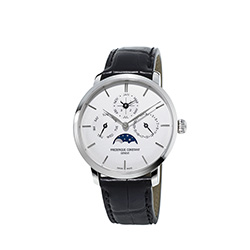 2. Frederique Constant Slimline Manufacture Perpetual Calendar FC-775S4S6 Серебристый корпус из полированной нержавеющей стали. Серебристый гильошированный циферблат с полированными вручную стальными центральными стрелками и накладными условными индексами, с чёрными стрелками календарных указателей. Чёрный ремешок из кожи аллигатора с серебристой стальной застёжкой. |