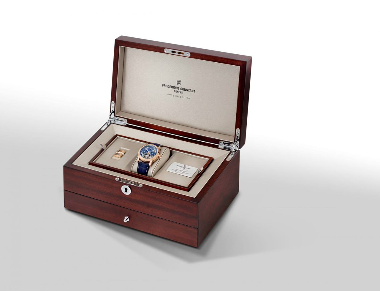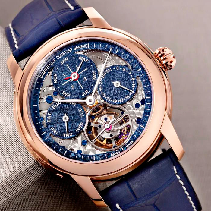 Frederique Constant выпускает одно уникальное издание своих успешных часов Tourbillon Perpetual Calendar Manufacture из 18-каратного розового золота с синим оттенком метеоритного скелета на циферблате с сердцебиением. Владельцу часов открывается взор на сложную механику часов.