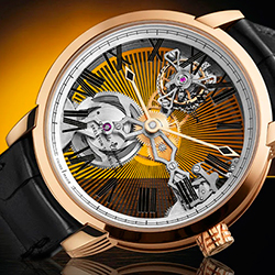 IO Skeleton Tourbillon имеет стеклянную заднюю крышку, металлизированную и украшенную элементами в виде солнечных лучей особой техникой гравировки – гильоше. Инновационная отделка будто притягивает солнце: свет проходит через сапфировые стекла, преломляется в центре и растекается к безелю мягким солнечным свечением. Это придает часам особую глубину и яркость. Несмотря на уменьшенный с 49 до 45 мм диаметр корпуса в визуальном впечатлении модель ничего не потеряла – часы по-прежнему полны света и сияния. IO Skeleton Tourbillon теперь выглядят на запястье более изящно и утонченно, а вся красота часового произведения искусства сосредоточена в меньшем диаметре.
