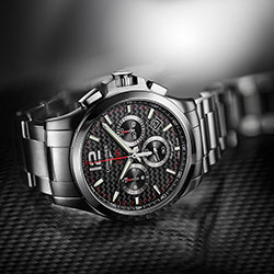 Модели из стали и с черным PVD-покрытием представлены в двух вариантах корпуса: диаметром 42 и 44 мм. Часы оснащены часовой, минутной и секундной стрелками. На циферблате размещены 30-минутный счетчик — на отметке «3 часа», 12-часовой счетчик — на отметке «9 часов» и 60-секундный счетчик — в центре. Корректировка показаний осуществляется с помощью электронной заводной головки. Индикатор срока службы батарейки предупреждает о необходимости заменить элемент питания. Новая модель хронографа доступна в нескольких вариантах цветового оформления: с циферблатами синего, карбонового, серебристого и черного цветов. Часы крепятся на стальной браслет или каучуковый ремешок черного/синего цвета.