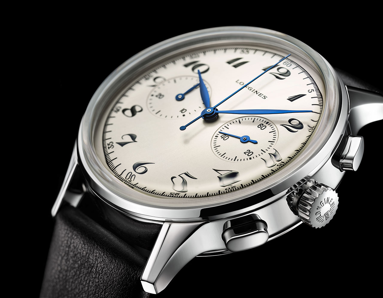Повторяя дизайн исторической модели, новый хронограф имеет выпуклый серебристо-белый циферблат с двумя искусно выполненными счетчиками: один на 30 минут, второй – для малой секундной стрелки. Гармоничные арабские цифры в характерном для того периода курсивном шрифте «dolphin» придают этим часам неповторимый облик. На циферблате у отметки «12 часов» символами в античном стиле изящно нанесена надпись «LONGINES». Подчеркивают красоту этих элегантных часов синие стальные стрелки листообразной формы под сапфировым стеклом с антибликовым покрытием.