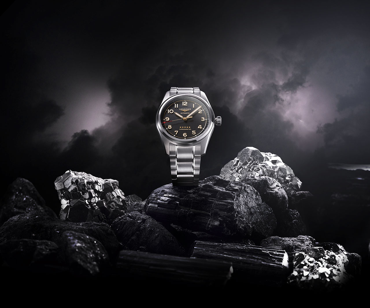 В часах Longines Spirit темные оттенки перекликаются с легким блеском, напоминая о происхождении материала — горная порода. Стрелки, цифры, звезды и песочные часы излучают приглушенное сияние мягкого золота (1N), создавая идеальный баланс между цветами и материалами, а отсутствие окошка даты только подчеркивает авиационную симметрию часов.