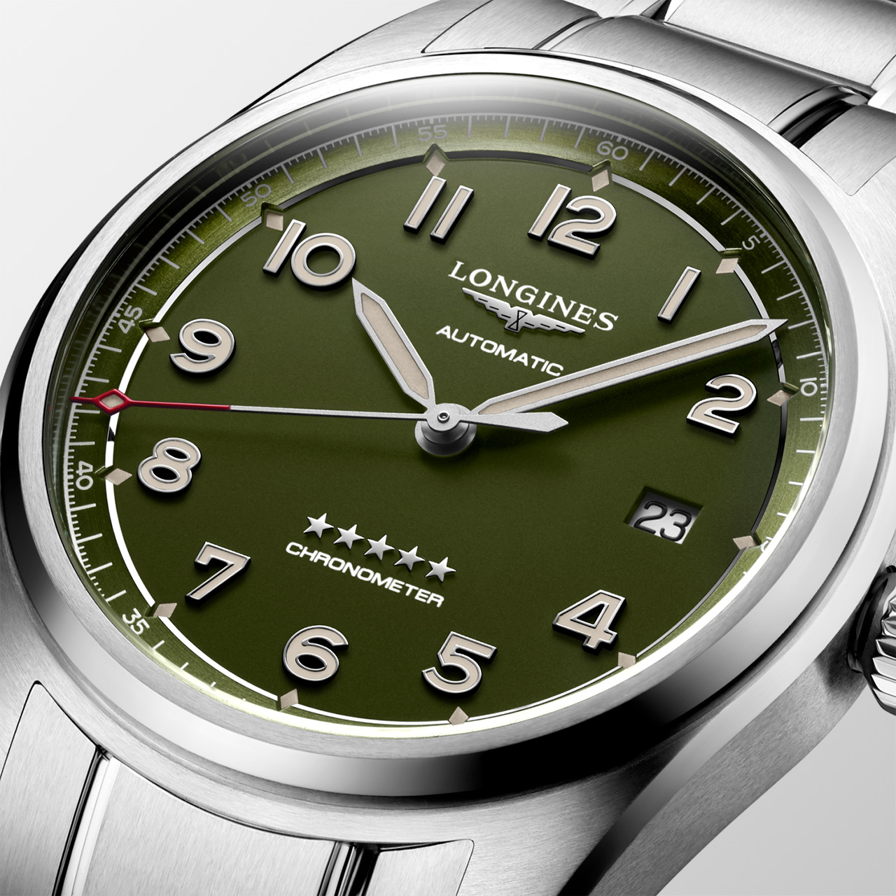 Новинка с зеленым циферблатом, оснащенная тремя стрелками и календарем, доступна в двух размерах – 40 и 42 мм. Новый цвет гармонично сочетается с бежевым покрытием Super Luminova в винтажном стиле, а пескоструйная обработка циферблата создает стильный металлизированный эффект. Как символ неизменно высокого качества механизмов Longines на циферблате модели изображены пять звезд.