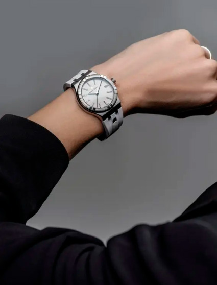 Maurice Lacroix также представляет новый двухцветный AIKON, представленный в корпусе диаметром 40 мм. Шесть рычагов, охватывающих безель из нержавеющей стали, отделаны золотом 4N PVD, что придает композиции теплоту. Серебристый циферблат, матовый от солнца, служит фоном для золотых стрелок и индексов, которые ярко сияют даже в пасмурный день. Отверстие для даты в положении «3 часа» также обрамлено золотом 4N PVD, что усиливает общее ощущение роскоши. Наконец модель представлена на пятирядном двухцветном браслете, завершающем образ этого стильного ансамбля.