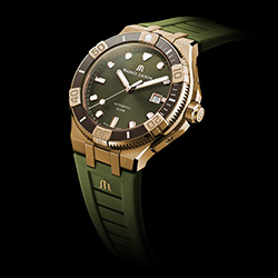 Впервые часы AIKON Venturer выпускаются в бронзе. Корпус диаметром 43 мм выполнен из особого сплава, который с течением времени способен покрываться патиной или темнеть, не разрушаясь при этом. Бронза известна человечеству многие века как самый долговечный материал для изготовления инструментов. Команда разработчиков Maurice Lacroix выбрала этот металл, чтобы подчеркнуть строгую функциональность моделей Venturer, и дополнила новинку подходящим циферблатом насыщенного зеленого цвета с отделкой «солнечные лучи». Гармонию натуральных теплых оттенков продолжает зеленый каучуковый ремешок с геометрическим узором. Благодаря системе Easychange каучуковый ремешок можно легко заменить на винтажный коричневый ремешок из телячьей кожи с бежевой прошивкой. Безель выполнен из коричневой керамики. Выступы на безеле, выполняющие роль часовых меток, выдержаны в стилистике AIKON Venturer. Как и корпус, они изготовлены из бронзы. Данная модель, оснащенная автоматическим механизмом ML 115, выпущена ограниченной серией из 500 экземпляров.