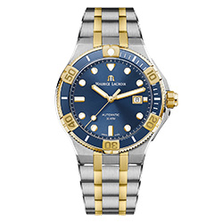 Еще одна новая версия AIKON Venturer выполнена из стали с позолоченными элементами оттенка желтого золота (2N). Если раньше модель была чисто функциональной, то сейчас Venturer предстает в новом свете. Теплый блеск драгоценного металла на звеньях браслета, заводной коронке и характерных для всей коллекции AIKON выступах на безеле придают особую роскошь этим часам. Темно-синий циферблат с отделкой «солнечные лучи» в сочетании с керамическим безелем того же оттенка подчеркивают спортивный характер модели. Выбор желтого золота и насыщенного синего цвета придает этим часам винтажный стиль в духе 80-х – новое направление в палитре Maurice Lacroix. Система замены браслета Easychange позволяет владельцу часов изменять их стиль за долю секунды. Данная модель, оснащенная автоматическим механизмом ML 115, пополнит основную коллекцию AIKON Venturer 43мм.