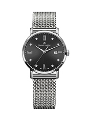 Корпусы из нержавеющей стали. Серебристые циферблаты с сатинированием в виде солнечных лучей. Стрелки и логотип с родиевым покрытием. Ремешок чёрного цвета из телячьей кожи или браслет миланского плетения из нержавеющей стали.