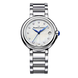 6. Модель FA1004-SS002-170-1: стальной корпус диаметром 32 мм; перламутровый циферблат с тремя синими стрелками и одиннадцатью бриллиантами; стальной браслет. |