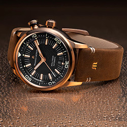 Первая модель выполнена в бронзовом корпусе диаметром 42 мм, который со временем приобретет уникальную патину, что придает часам винтажный вид. Чёрный циферблат украшен стрелками и метками золотистого цвета, покрытыми Super-LumiNova® для яркого свечения в темноте. Часы поставляются с коричневым кожаным ремешком, создавая элегантный образ. Эта модель выпущена ограниченным тиражом — всего 888 экземпляров.