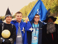 На причале нас встречал главный «звездочёт» московского офиса ULYSSE NARDIN Максим Андрианов со своей командой. Мантии и колпаки со звёздами - никто из нас не ожидал такой яркой театрализованной встречи. Собранные, активные, деловые в обычной жизни ребята раскрыли здесь и свой творческий потенциал.