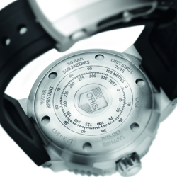 Все эти параметры специалисты компании «Oris» реализовали в часах «Oris Aquis Depth Gauge» – первых дайверских часах, которые позволяют воде проникать внутрь корпуса для измерения глубины погружения. При этом стальной корпус часов диаметром 46 мм с завинчивающейся задней крышкой, обладает требуемой водостойкостью, а именно – 500 м (50 атм.). Такой корпус хорошо зарекомендовал себя в коллекции «Aquis». Стальная задняя крышка корпуса содержит выгравированную шкалу пересчёта метров в футы от нуля до 100 м / 325 футов. Данная шкала позволяет достаточно быстро пересчитывать глубины всем дайверам, которые осуществляют свою деятельность в странах, где используются метрическая и английская системы мер.