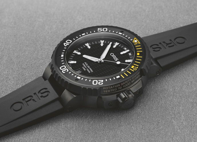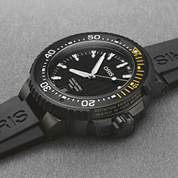 Среди специальных технических характеристик этой модели – запатентованная Oris система фиксации ободка Rotation Safety System, известная как RSS. Это эксклюзивно используемое Oris устройство, разработанное по заказу сообщества профессиональных подводников, позволяет владельцу часов настраивать положение дайверского ободка одностороннего вращения и фиксировать его положение. Это означает, что во время погружения подводник сможет с абсолютной уверенностью определять оставшееся время погружения. Рельефная каучуковая накладка упрощает работу даже в перчатках, а жёлто-белая минутная шкала, выгравированная на устойчивой к появлению царапин керамической вставке ободка, обеспечивает высокую чёткость индикации даже при слабом освещении.