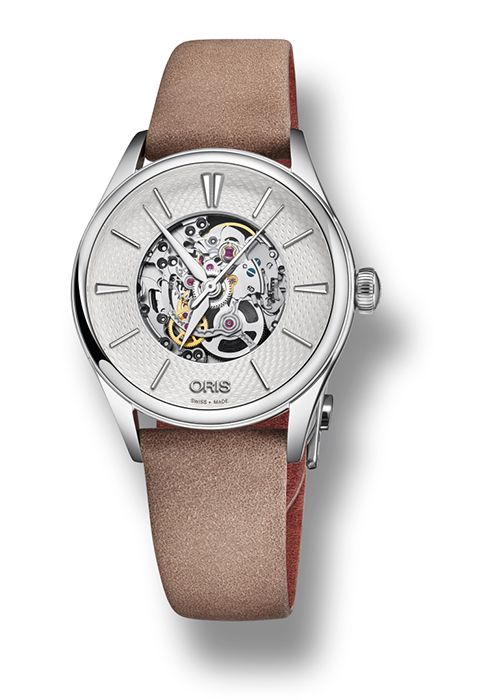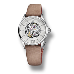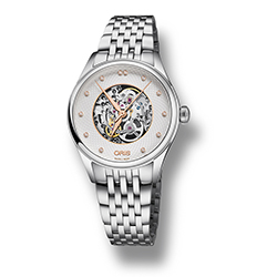 Скелетонированный механизм часов дополнен изящными стрелками классической формы. Серебристое внешнее кольцо циферблата украшено рельефным узором «гильоше» и полированными маркерами часов или бриллиантовыми маркерами. Изготовление часов со скелетонированным механизмом как ничто другое позволяет часовщику в полной мере продемонстрировать свой талант. Процесс скелетонизации предполагает удаление некоторой части циферблата, чтобы показать всю красоту деталей и устройства механизма. Подобная работа требует дополнительной кропотливой отделки деталей. А после ее завершения взору открывается впечатляющая, завораживающая картина с колесами часового механизма, вращающимися словно в балете. Часовщики Oris применили эту технику в новых женских часах Artelier Skeleton диаметром 33 мм. Тем самым они очередной раз подтвердили высочайший уровень мастерства в своем деле.