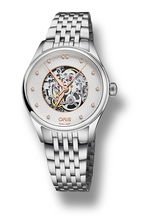 Швейцарский производитель часов Oris представляет новинку из коллекции Artelier Skeleton с корпусом диаметром 33 мм. Одна из моделей этой линейки украшена 12 бриллиантами на циферблате и декоративными деталями тона розового золота.