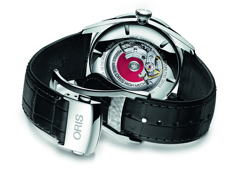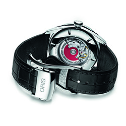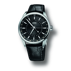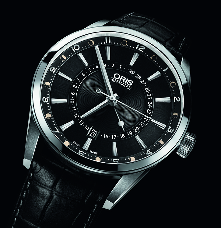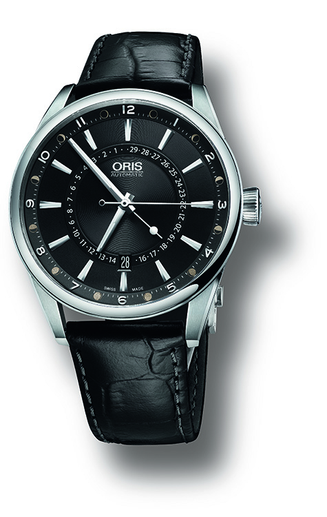 Новые стильные часы «Oris Artix Pointer Moon» предлагаются на чёрном кожаном ремешке с крокодиловым тиснением и стальной раскладывающейся застёжкой, или на металлическом браслете.