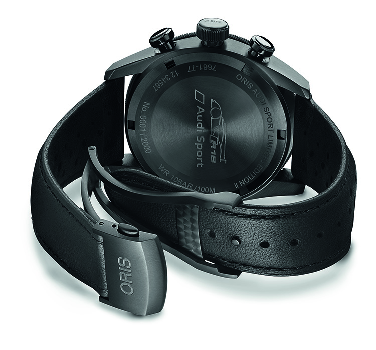 Новый спортивный хронограф «Oris Audi Sport Limited Edition II» укомплектован чёрным перфорированным кожаным ремешком гоночного стиля с раскладывающейся браслетной застёжкой из титана с чёрным DLC-покрытием. К часам также прилагается сертификат и специальная коробка.
