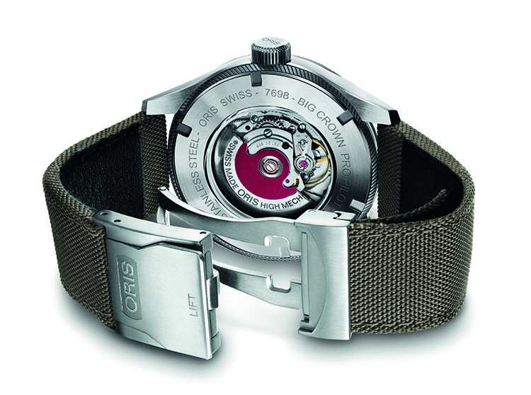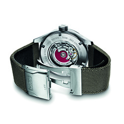 Новинка марки «Oris» комплектуются текстильным ремешком цвета хаки, снабжённым раскладывающейся застёжкой-бабочкой, изготовленной из нержавеющей стали.