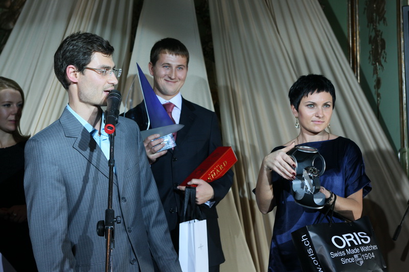 Генеральный директор представительства швейцарской часовой компании ORIS в России Павел Ларин презентовал Евгению часы из серии ORIS Divers, а другой партнер номинации компания Volvo Car's Russia - вручила победителю право пользования автомобилем Volvo на срок 1 год.
