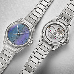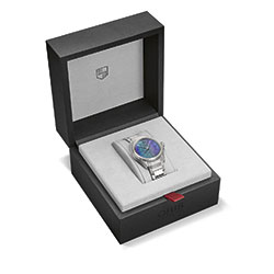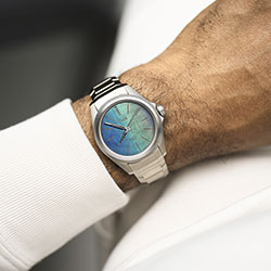 - Циферблат: Особенность этой модели — титановый циферблат, созданный при помощи лазерной техники. В зависимости от угла падения света, его цвет меняется от синего до зелёного и фиолетового, не используя пигменты, а только манипулируя поверхностью металла для преломления света.