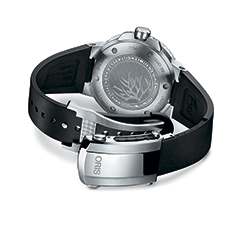Черный каучуковый ремешок с разработанным Oris предохранительным якорем и раскладывающейся застежкой со скользящим устройством настройки длины ремешка.