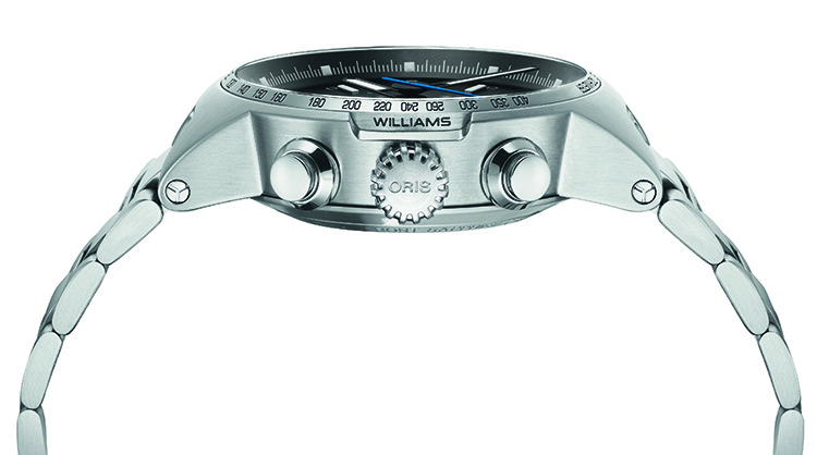 Круглый сборный корпус часов «Oris Williams Chronograph» выполнен из нержавеющей стали, его диаметр равен 44 мм. Передняя сторона корпуса снабжена укреплённым безелем с тахиметрической шкалой. На боковой стороне корпуса, в направлении «3 часа», установлена завинчивающаяся рифлёная заводная головка, торец которой украшает выгравированное наименование марки. В специальной выемке перед заводной головкой помещено выгравированное название команды «Williams».