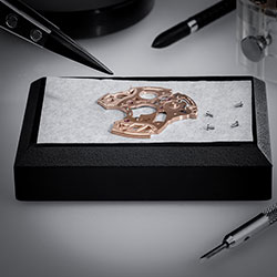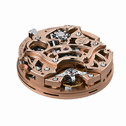 Декорирование золота не менее сложно технически и требует более 50 рабочих часов на одну единицу. Каждый часовой механизм имеет концентрический вырез на мостах вокруг баланса. Выделенный таким образом баланс становится центром механического спектакля. Мосты ажурированы специально для того, чтобы были виден механизм, «пульсирующий» на их фоне, и два колонных колеса, расположенных симметрично по отношению к оси заводной головки. Свой вклад в общую картину вносят зерненые и сатинированные элементы, а также внутренние углы на мостах, на которых играют лучи света, подчеркнутые отблесками золота.