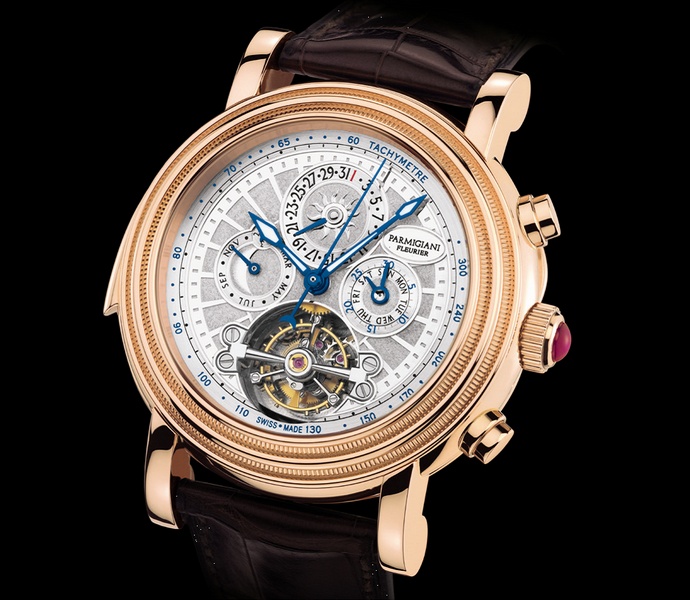 Выдающиеся возможности мануфактуры Parmigiani воплощены в модели TecnicaCosmos. В корпусе из розового золота и заводной головкой с рубином множество усложнений – турбийон, вечный календарь, хронограф, минутный репетир.