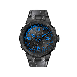 Оттенок небесной лазури занимает центральное место в дизайне. Часовая, минутная и секундная стрелки, минутные индексы, рельефные индексы на сапфировом стекле, арабские цифры 3, 6, 9 и 12 – всё окрашено в яркий люминесцентный синий цвет «электрик» (Turbine Pilot A1095/2). Насыщенная синева контрастирует с черным нижним циферблатом и спиралью, украшающей центральную часть турбины. Для тех, кто предпочитает более сдержанный стиль и цветовое решение «тон в тон», на смену синему приходит люминесцентный серый (модель Turbine Pilot A1095/1).