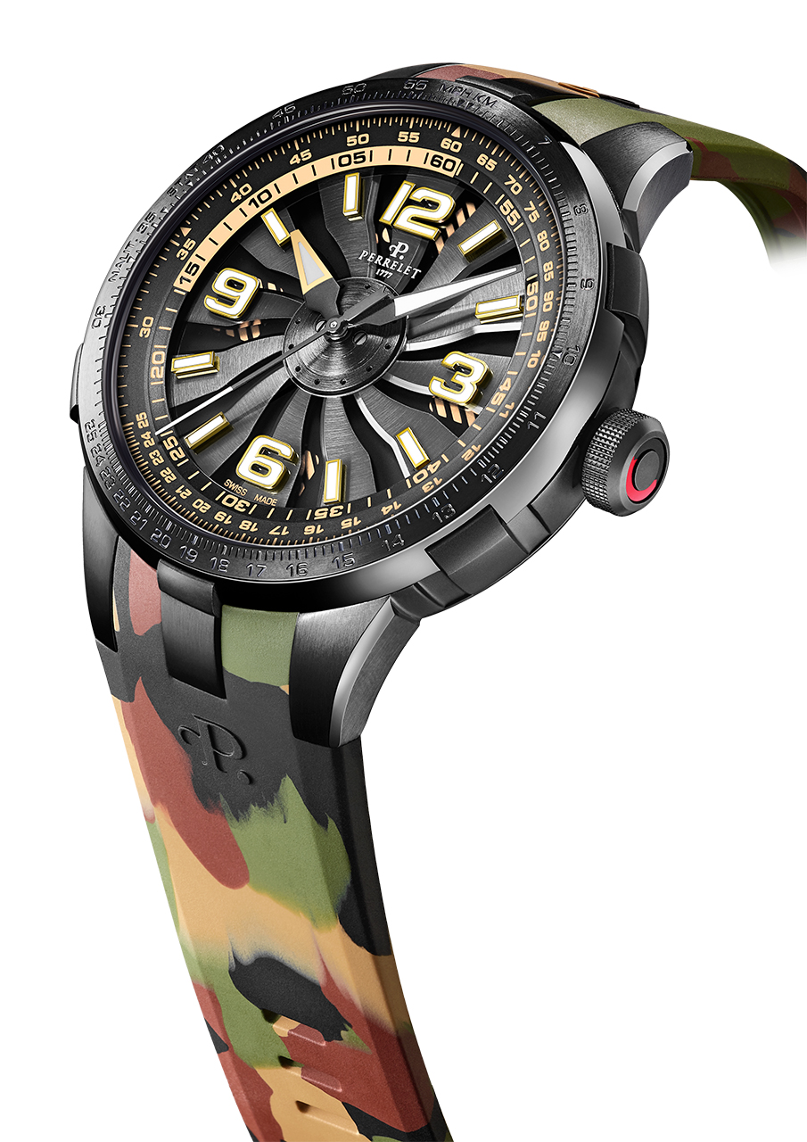 Perrelet всегда демонстрировал мастерское использование цвета в часах Turbine. Три из новых моделей Turbine Pilot выполнены в ярких цветах – синем, красном и желтом. Четвертая версия выполнена в камуфляже – классических зеленых, коричневых и бежевых тонах.