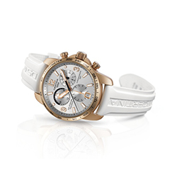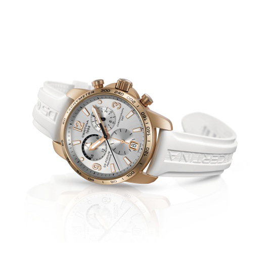 Все модели нового женского кварцевого хронографа «Certina DS Podium GMT Chronograph Aluminium» комплектуются комфортными каучуковыми ремешками, снабжёнными застежкой-пряжкой. Цвет ремешка соответствует цвету циферблата модели. Вес часов, вместе с ремешком, составляет всего 55 грамм.